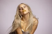 - Платье - John Galliano, цепочка на теле - Mathieu Mirano, ожерелье, которое носит в качестве головного убора - Halaby, и протез ноги - Marla Weinhoff.
