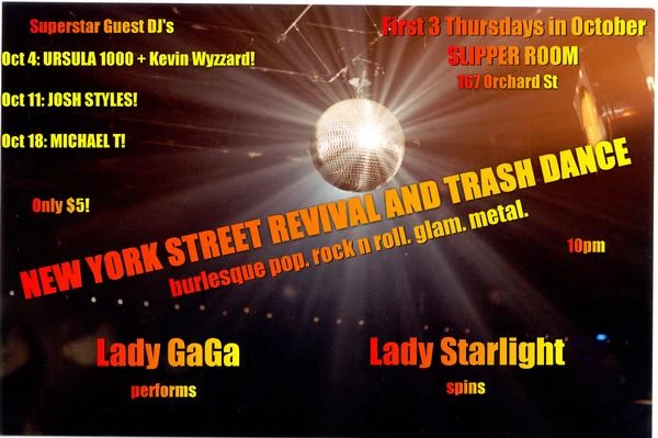 The New York Street Revival and Trash Dance второе совместное шоу Гаги и Леди Старлайт. Это была поп-бурлеск, рок-н-ролл, глэм вечеринка. Гага уже становилась блондинкой в это время. Шоу длилось всего месяц, после которого Гага начинала вступать одна. Это был последний раз когда они сотрудничали, до того как Старлайт присоединилась к Гаге в туре The Fame Ball Tour в 2009.