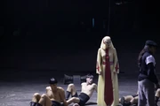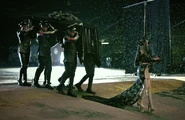 Gaga then speaks the first few phrases in front of the coffin, before the song actually begins with her in front of the window, looking down at a group of men in boots and black tight-fitting boxing briefs. The men dance in a choreographed fashion in front of a movie theater-type screen (which shows scenes of warfare) as Gaga sings above them, and they then began to dance one-on-one with each other. Gaga is then shown in bed, wearing a red latex nun's outfit and holding a rosary, as she speaks the next few phrases. The scene then suddenly cuts to show Gaga and a man imitating anal sex, but with Gaga taking the dominant role, as men in high heels surrounding them dance and frolic. Gaga then leads a group of male dancers in dancing. Scenes change again to show Gaga in a yellow latex gown adorned with her stylized cross in red surrounded by more men, who then proceed to throw her up in the air and catch her over and over again, while the scene cuts once to show her in bed, wearing the red nun outfit, putting the rosary into her mouth. Black and white scenes show Gaga dancing alone in a 70's-styled cat suit before being joined by men in uniforms marching towards her, while another scene (in color) shows her, in a similar outfit but wearing a bra with rifle barrels attatched, dancing with the same men. Gaga is then seen singing the "Alejandro" verse into a microphone alone in the dark on a stage, wearing sunglasses, a black jacket, underwear and bra, while the camera pans on men in military uniforms, specifically, a man in uniform who then takes off his hat, as a blurred background scene of a mob running around is shown. Black and white clips of previous scenes are shown, and then the scene changes again to Gaga in her yellow gown. Men in black briefs surround her, and Gaga strips off the gown as she falls to the ground over one of the men. The camera then pans on Gaga, in the red nun outfit, with Alejandro still sitting at the edge of the bed. As the camera approaches her, the film begins to burn from her face outwards.