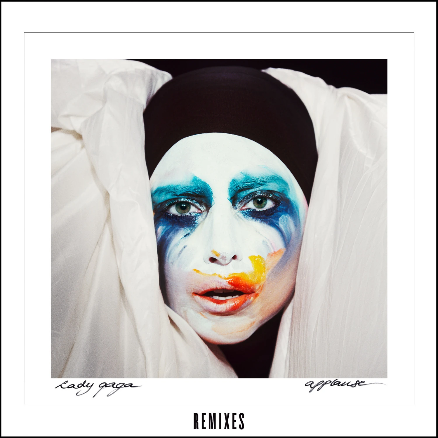 The artwork was shot by Inez and Vinoodh, who also shot the music video for "Applause". The photograph features colorful, emotional and theatrical, capturing Gaga with a Pierrot-esque face, her rainbow of makeup artfully smeared and her hair covered under a head wrap. Gaga added colors to the printed photograph which was later scanned to be the single artwork. The central image is placed on a double black bordered white canvas, the text was handwritten by either Inez or Vinoodh. |
