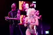 - Lady Gaga wears a choker and a bra piece by Fouad, a bra by YOSHiKO☆CREATiON PARiS, custom briefs by Linda Stokes, boots by Fantasy Shoes, a brooch by Chanel, a vintage unsigned brooch, and an unknown Maltese cross brooch on her briefs.