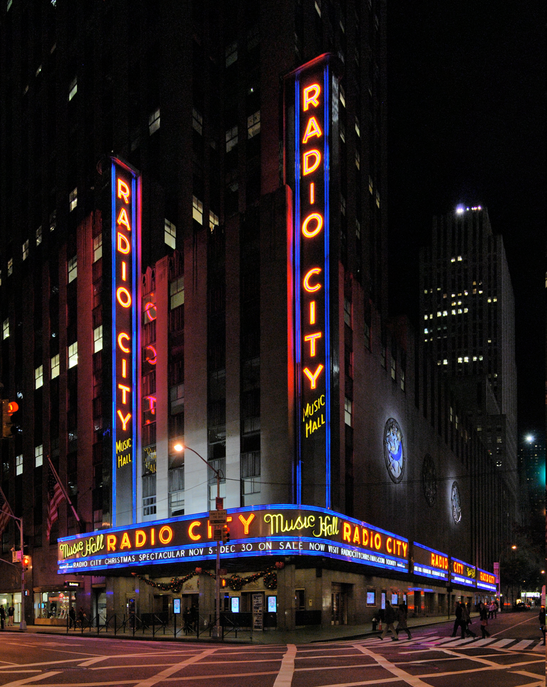 Radio City Music Hall is an entertainment venue located at 1260 Avenue of the Americas at Rockefeller Center in Midtown Manhattan, New York City. Nicknamed the Showplace of the Nation, it was for a time the leading tourist destination in the city. The venue is notable as the headquarters for the precision dance company, the Rockettes.